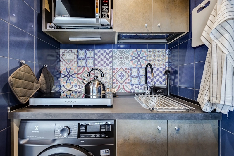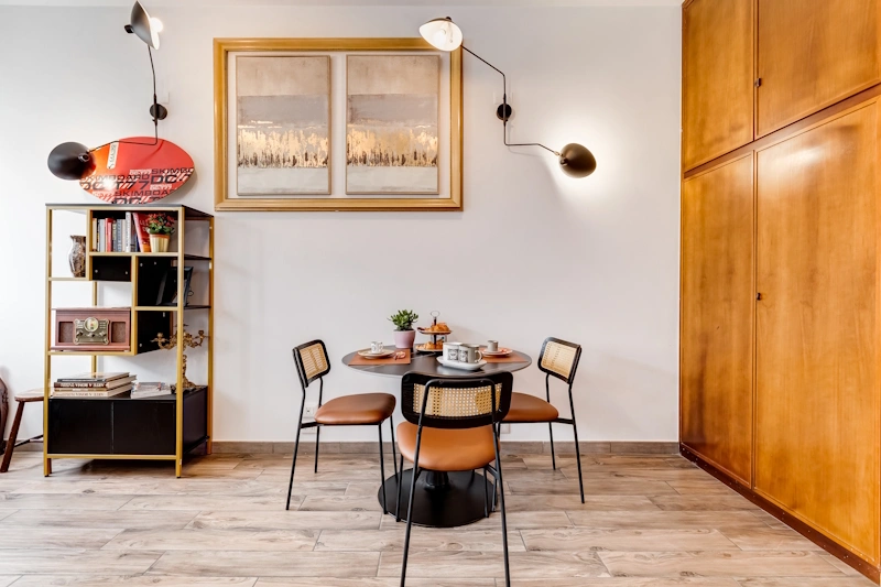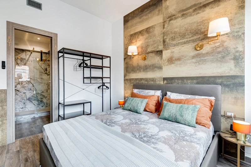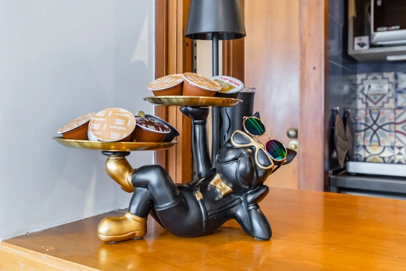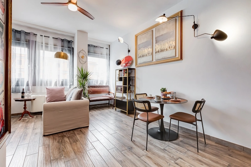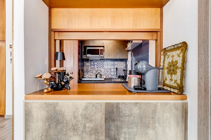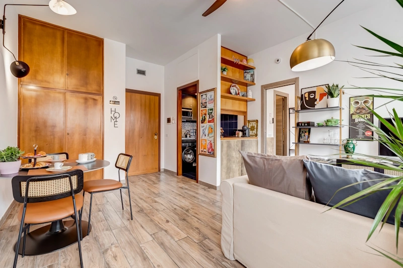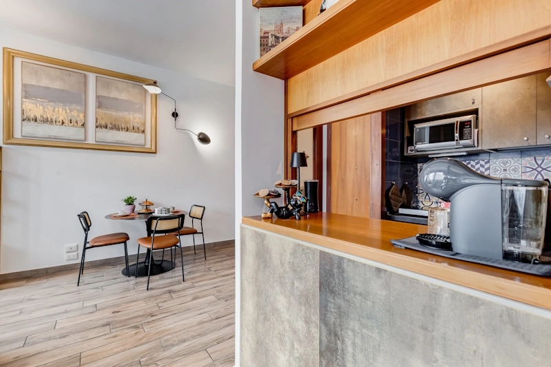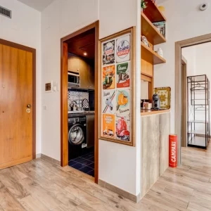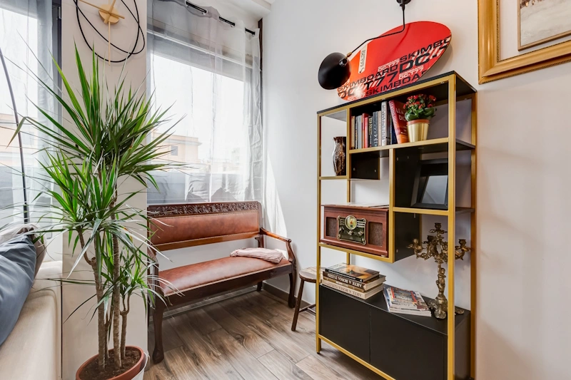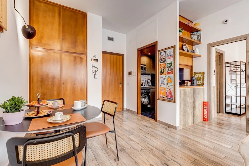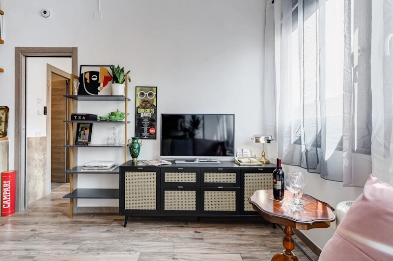 L'appartamento è composto da uno spazioso soggiorno che accoglie i tuoi momenti di relax, una piccola cucina completamente attrezzata, ideale per preparare piatti tipici italiani, e una camera da letto matrimoniale che garantisce il massimo del riposo. Qui, ogni dettaglio è stato curato con passione, fondendo elementi moderni e vintage in un ambiente che emana classe e calore.